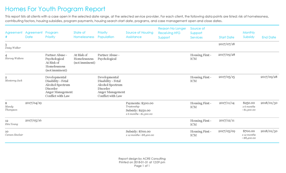 This report lists all clients with a case open in the selected date range, at the selected service provider. For each client, the following data points are listed: risk of homelessness, contributing factors, housing subsidies, program payments, housing search start date, programs, and case management open and close dates.