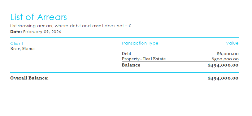List showing arrears, where debt and asset does not = 0