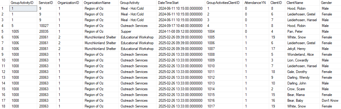 This view compiles relevant information about each group activity with a record for each attendee.